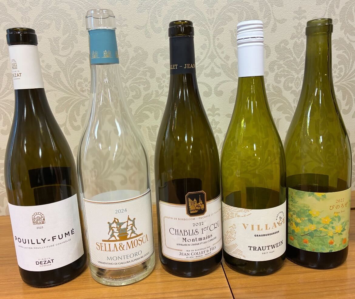 左からVigneron Firmin Dezat Pouilly-Fumé, Sella & Mosca Monteoro Vermentino di Gallura Superiore, Domaine Jean Collet Chablis Premier Cru Montmains, Trautwein Village Grauburgunder, こことあるシリーズ2022 ぴのろぜ